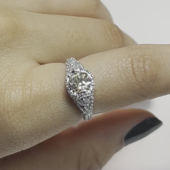 This ring features a 1.15ct light brown center with 0.72cttw white melee diamonds, set in 18k white gold.