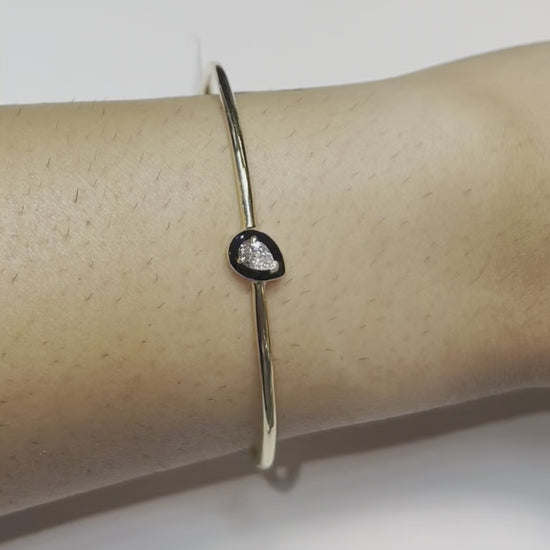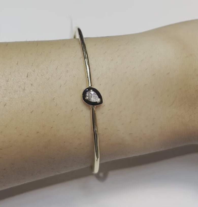 This open cuff bracelet features a #ct pear shaped diamond, with enamel details, set in 14k yellow gold.