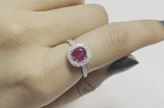 This ring features a 1.55ct natural ruby with 0.52cttw in diamonds, set in 14k white gold.